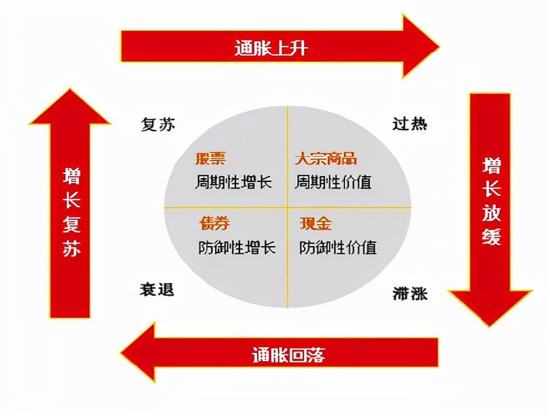 关于经济面的解读,美林时钟是不可跳过的一章。美林时钟”是2004年由美林证券提出,基于对美国1973年到2004年的30年历史数据的研究,将资产轮动与经济周期联系起来,是资产配置领域的经典理论,是一个非常实用的指导投资周期的工具。
