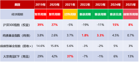 1.衰退:债券基金>货币基金>股票基金>商品基金