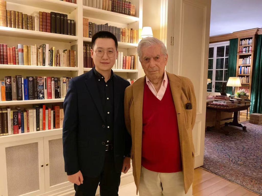 中文译者侯健与略萨 在略萨家中。供图:侯健