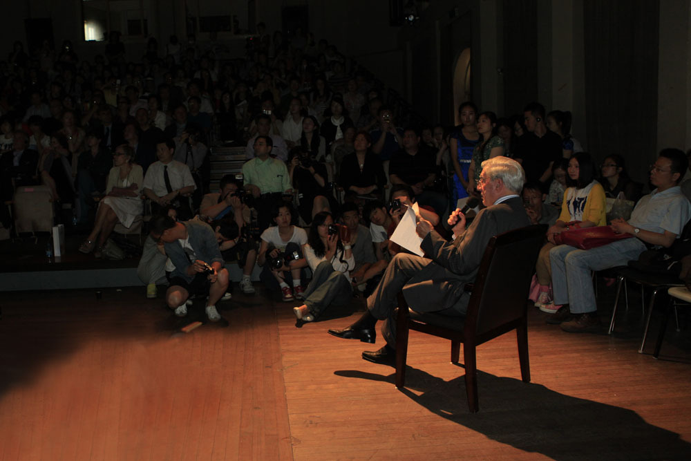 2011年,略萨(中)与孙甘露(右)、叶兆言(左)展开对话。供图:99读书人